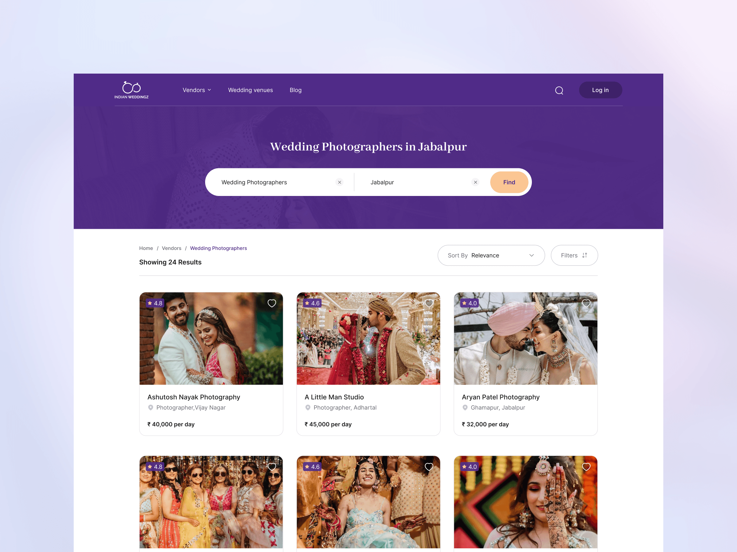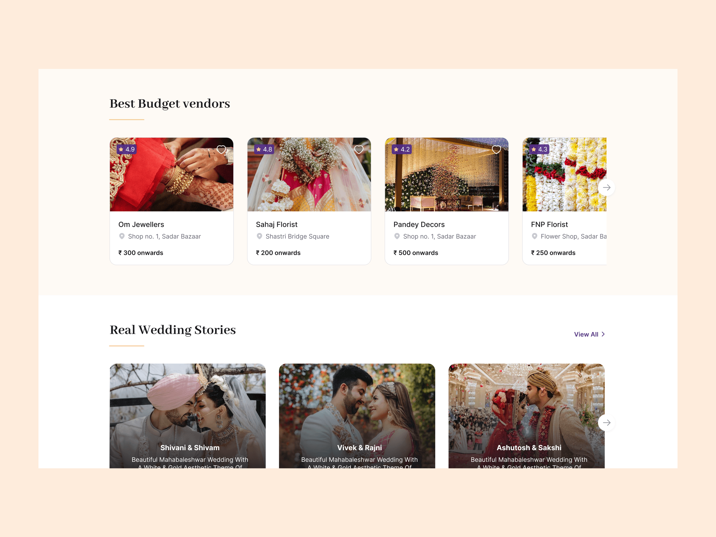 Indian Weddingz is a wedding planning platform that helps couples discover, compare, and book wedding vendors with ease. The platform aims to simplify the planning experience by providing curated vendor listings, personalized dashboards, and interactive planning tools all within an intuitive, visually rich interface that reflects the joy and elegance of Indian weddings.